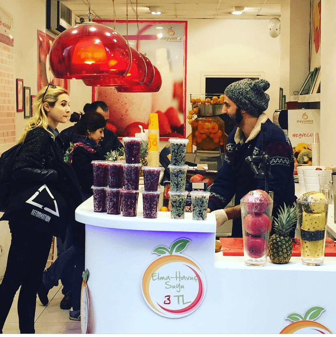 Le menu de Meyvemix est idéal pour l'été : des jus frais pressés sous vos yeux, rafraîchissants et parfaits pour purifier le corps. L'enseigne propose jus de fruits simples (orange, pomme, melon, grenade, kiwi) ou mélanges de saveurs (ananas-fraise-pomme-orange ; mangue-ananas-banane). Bref, il y en a pour tous les goûts et à partir de 3 livres turques.