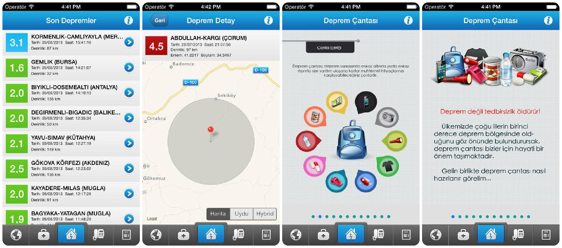 L'application utilise les relevés sismiques de l'observatoire de Kandili (Université du Bosphore) pour les partager en temps réel et les géo-localiser sur une carte. Les informations sur chaque séisme recensé sont complètes: magnitude sur l'échelle de Richter, date, heure, profondeur, latitude et longitude.