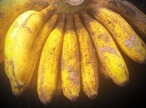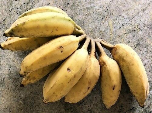 Après cueillette, la peau épaisse et rugueuse de ces petits fruits devient jaune doré. Le goût est doux et très sucré. Ces bananes sont aussi excellentes cuites comme l’illustre notre recette en fin d’article.