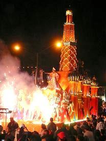 Enfin, au soleil couchant, le cortège s'élance lentement sur un trajet d'une dizaine de kilomètres. Sous une pluie de serpentins et de confettis, le public en extase suit le défilé lumineux et sonore des trente-quatre chars allégoriques, où siègent la Reine et toute sa cour !