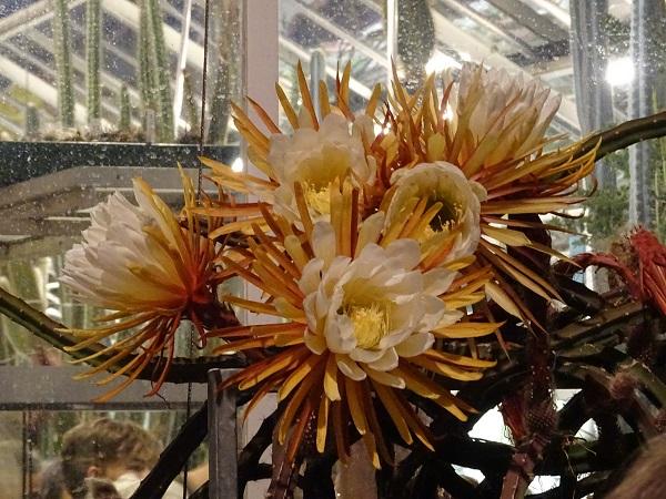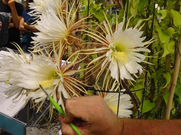 Dimanche soir, les 24 fleurs des 3 plants de Reine de la Nuit de la cacteraie ont donc commencé à s'ouvrir à la tombée de la nuit, pendant que le public attendait, impatient. Les plus motivés sont restés jusqu'à sa floraison complète, après 23h. Ce matin, les 24 fleurs étaient fanées. La plante se déshydrate en effet fortement en fleurissant, et ses fleurs se referment donc aux premiers rayons du soleil et se dessèchent.