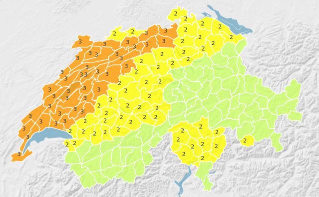 Bien que moins forts qu'en Suisse romande, les vents d'Ouest souffleront tout de même en rafales jusqu'à la fin de soirée sur la Suisse alémanique, placée en alerte 2 par Météo Suisse. Ces vents sont accompagnés de pluie en plaine et de neige au-dessus de 800-1100m, et devraient s'affaiblir en cours de soirée.
