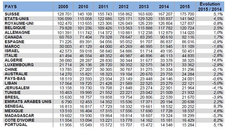212.026 Français se sont inscrits sur les listes des pays hors de l'Union Européenne, soit 4,2% de plus qu'en 2014. La Suisse, premier pays d'accueil des Français, avec 175.700 inscrits en 2015, enregistre une hausse de 5,1%. L'Ouzbékistan, la Serbie, l'Islande connaissent tous les trois des augmentations supérieures à 10%, mais ces pays accueillent parmi les plus petites communauté françaises, toutes inférieures à 2000 ressortissants.